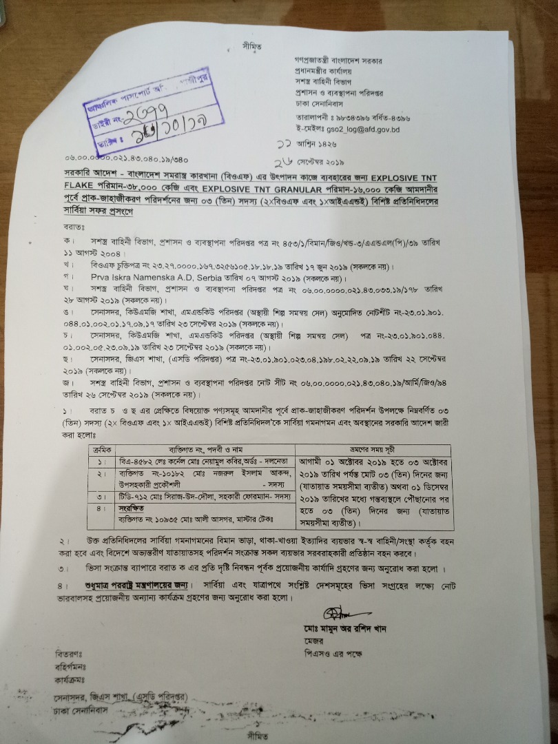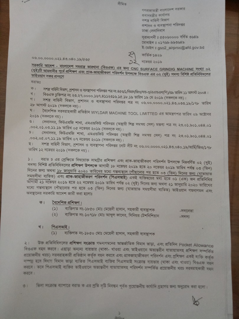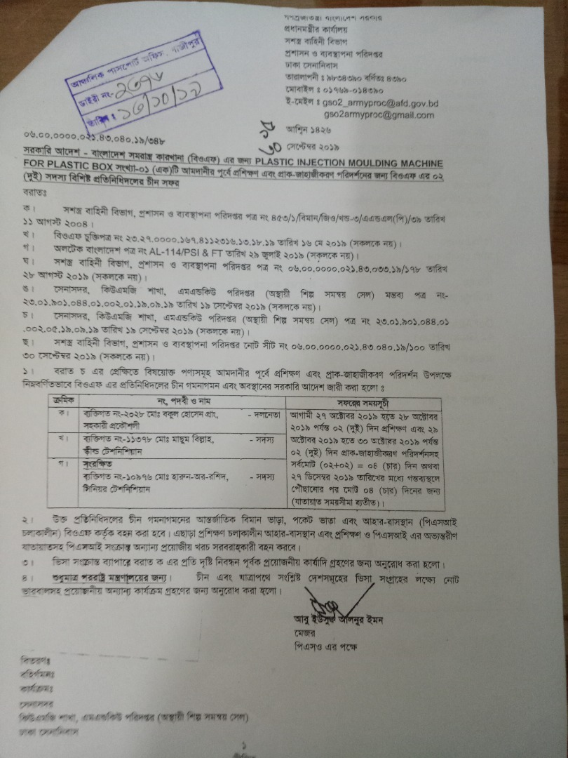 | 9. | বিএ-4755 কর্ণেল মোঃ শিহাবুল ইসলাম, ইএমই, বিওএফ, বিএ-4382 মেজর এইচ এন মাহবুব রায়হান, আর্টি, বিএ-6166 মেজর মোঃ মনিরুজ্জামান মিয়া, অর্ডন্যান্স | 29.02.20 | |